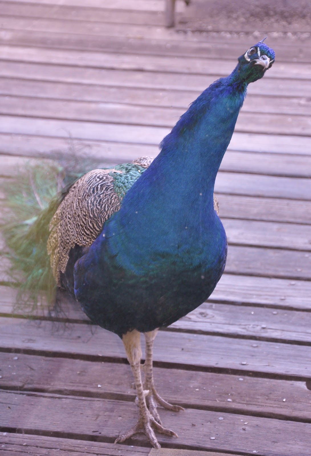 | The neighbor's peacock surprised me one day on our back deck. His "song" was loud and anything but melodic. Did that make his music any the less acceptable to the ears of our Creator? |